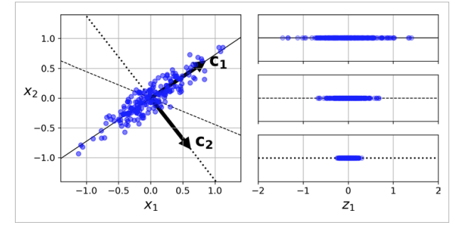 주성분 분석(PCA)는 가장 보편적인 차원 축소 알고리즘 중 하나인데, 데이터의 분포를 최대한 유지하려 하면서 저차원에 투영시킵니다.