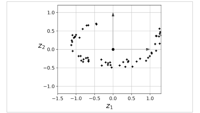 여기서 모든 data를 2차원 subspace에 투영하면 다음과 같은 2차원 데이터셋을 얻었는데, 이것으로 우린 데이터셋의 차원을 3에서 2차원으로 줄였다고 할 수 있습니다. 그리고 이에 따라 데이터는 새로운 feature인 $z_1$과 $z_2$에 대응됩니다.