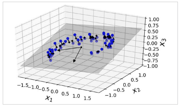 PC를 모두 추출했다면, 이제 처음 d개의 PC로 정의한 초평면에 투영하여 데이터셋의 차원을 d차원으로 축소해야합니다. 이때의 초평면은 데이터의 분산을 최대한 보존하게 투영시킴을 보장합니다.