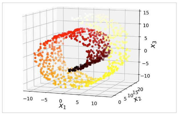 그러나 다음 그림에서 표현된 스위스 롤 데이터셋에선 투영이 그다지 좋은 방법은 아닙니다.