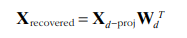 이렇게 d차원으로 축소된 데이터셋 $X^{d-proj}$을 얻고 싶다면 다음 식과 같이 기존 데이터로 이뤄진 행렬 $X$와 분산을 가장 높게 보존하는 d개의 PC의 단위벡터를 가지는 $W_d$를 행렬곱하여 얻을 수 있습니다.