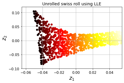 결과는 다음 그림에서 볼 수 있습니다. 보다시피 스위스 롤이 잘 펴졌고, 샘플 간 거리도 잘 보존되어있는 듯 하지만, 거시적으로 보면 샘플 간 거리가 잘 유지도히지 않습니다. 그렇지만 LLE는 매니폴드를 펼치는데 잘 동작합니다.