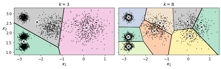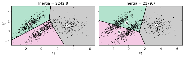 다음 그림에서 왼쪽 솔루션의 이너셔는 223.3, 오른쪽은 237.5입니다. KMeans 클래스는 n_init번 실행하여 이너셔가 가장 낮은 모델을 리턴합니다.