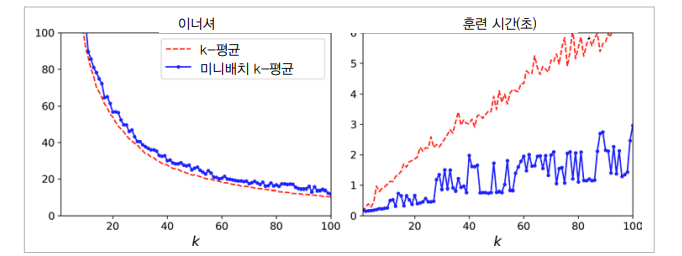 왼쪽 그래프의 경우 곡선의 차이가 일정하게 유지되는 듯 보이지만, 클러스터의 개수가 늘어날 수록 이너셔가 점점 줄어들기 때문에, 차이가 차지하는 비율은 점점 커집니다. 그러나 오른쪽 그래프를 보면 mini-batch K-Means가 일반적인 알고리즘보다 훨씬 빠르다는 것을 확인할 수 있습니다.