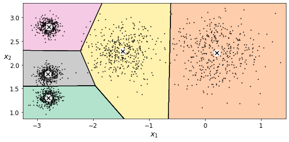 그리고 클러스터의 결정 경계를 그리면 다음과 같은 다이어그램을 얻을 수 있습니다. 이때 센트로이드는 $X$로 표시되어있습니다. 대부분의 데이터는 잘 할당이 되어있는데, 클러스터의 경계 부근 특히 핑크색과 노란색 클러스터 사이의 데이터 몇개는 잘못된 레이블이 부여되어있습니다.