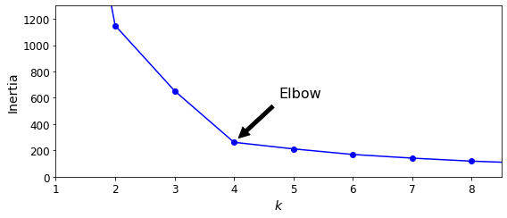 위 그림에서 보듯이 $k = 4$까지는 빠르게 이너셔가 감소하는걸 확인할 수 있습니다. 이 지점을 Elbow라 칭하는데, 보통 이 지점을 넘어서면 이너셔가 줄어드는 속도가 매우 줄어들기 때문에 $4$를 넘어선 클러스터의 개수는 크게 도움이 되지 않습니다. 따라서 보통 이 Elbow를 최적의 클러스터 개수로 고르게 됩니다.