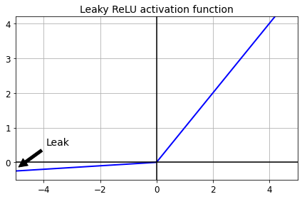 하이퍼 파라미터 $α$는 이 함수가 새는 정도를 결정합니다. 즉 샌다는 것은 음수 영역에서의 함수의 기울기를 의미하며 보통 $0.01$로 설정합니다. 바로 이 작은 기울기가 LeakyRelu가 절대 죽지 않게 해주는 것입니다. 실제로 성능도 훨씬 좋습니다. 다음은 LeakyRelu 사용법입니다. 적용하려는 층 뒤에 붙여주면 됩니다.