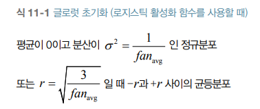 케라스는 기본적으로 균등분포의 글로럿 초기화를 사용합니다. 여기서 kernel_inializer = "he_uniform"이나 kernel_inializer = "he_normal"로 바꾸어 He 초기화를 사용할 수 있습니다.