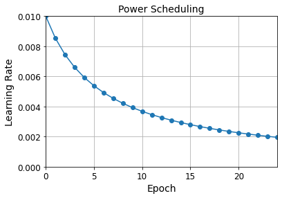 다음은 거듭제곱 기반 스케줄링을 keras에서 구현한 것입니다. 여기서 decay는 우리가 앞서 보았던 스텝 수 $s$의 역수입니다. (keras는 이를 1로 가정합니다.)