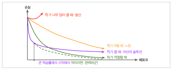 다만 초기 학습률 $n_0$과 $s$는 우리가 지정해줘야하는 하이퍼 파라미터에 속합니다.
