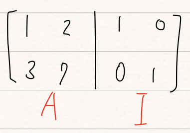위와 같이 행렬 $A$와 역행렬을 가진다면, 그 역행렬과 곱했을 때는 단위 행렬이 나와야할 것입니다. 그때 이 역행렬을 구해보세요!라고 얘기를 한다면, 다음과 같이 우선 그림을 그려주시면 됩니다!