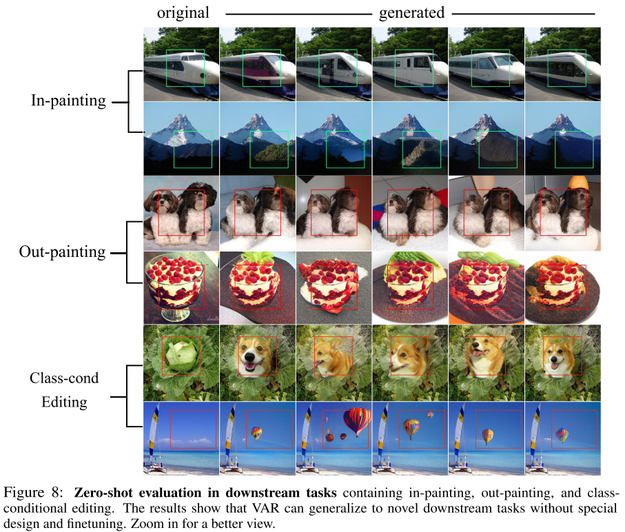 또한, VAR 모델은 in-painting, out-painting과 같은 다양한 downstream task에서 zero-shot generalization 능력을 보여주었습니다. 이는 VAR 모델이 단순히 이미지를 생성하는 것을 넘어 이미지의 구조를 이해하고 활용할 수 있음을 의미합니다.