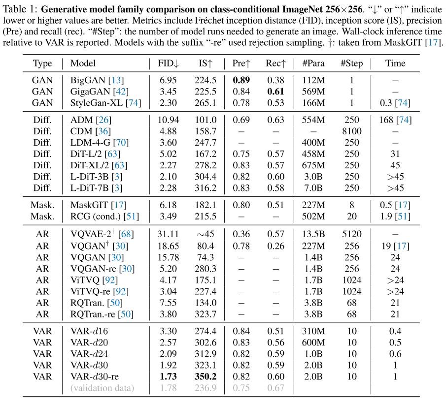 - 뛰어난 이미지 생성 성능: VAR은 기존의 diffusion 트랜스포머 모델을 능가하는 이미지 생성 품질과 추론 속도를 제공합니다.