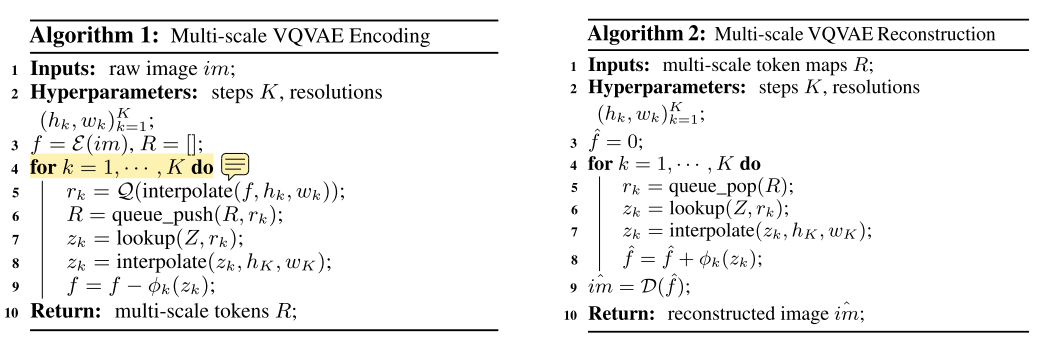 - Multi-scale VQVAE 인코딩: 학습된 VQVAE를 사용하여 입력 이미지를 여러 해상도의 토큰 맵으로 인코딩합니다.