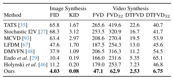 - 낮은 FID, KID, FVD, DTFVD 점수: 논문에서 제시하는 방법이 기존의 single-image animation 방법들보다 이미지 합성 품질 (FID, KID) 및 비디오 합성 품질 (FVD, DTFVD) 측면에서 월등히 뛰어난 성능을 보임. 특히, DTFVD (Dynamic Texture Frechet Video Distance) 점수는 제안 방법이 자연스러운 동적 텍스처를 잘 생성한다는 것을 입증.