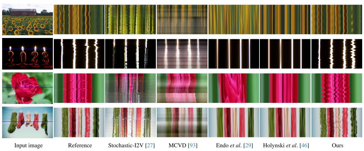 - X-t slices 시각화: 제안 방법으로 생성한 비디오의 X-t 슬라이스(시간에 따른 움직임을 시각화한 그래프)가 ground truth 비디오의 X-t 슬라이스와 가장 유사함. 반면, 기존 방법들은 움직임이 너무 부드럽거나, 비주기적이거나, 일관성이 없는 패턴을 보임.