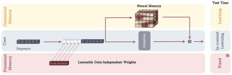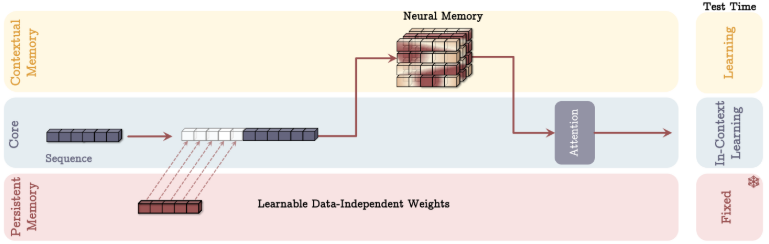 - Memory as a Layer (MAL): 이 경우, long-term memory module 자체가 neural network의 layer 역할을 하여 attention 메커니즘을 통과하기 전에 입력 시퀀스를 처리합니다. attention이 현재 context에 집중하기 전에 전용 메모리 처리 단계를 갖는 것과 같죠.